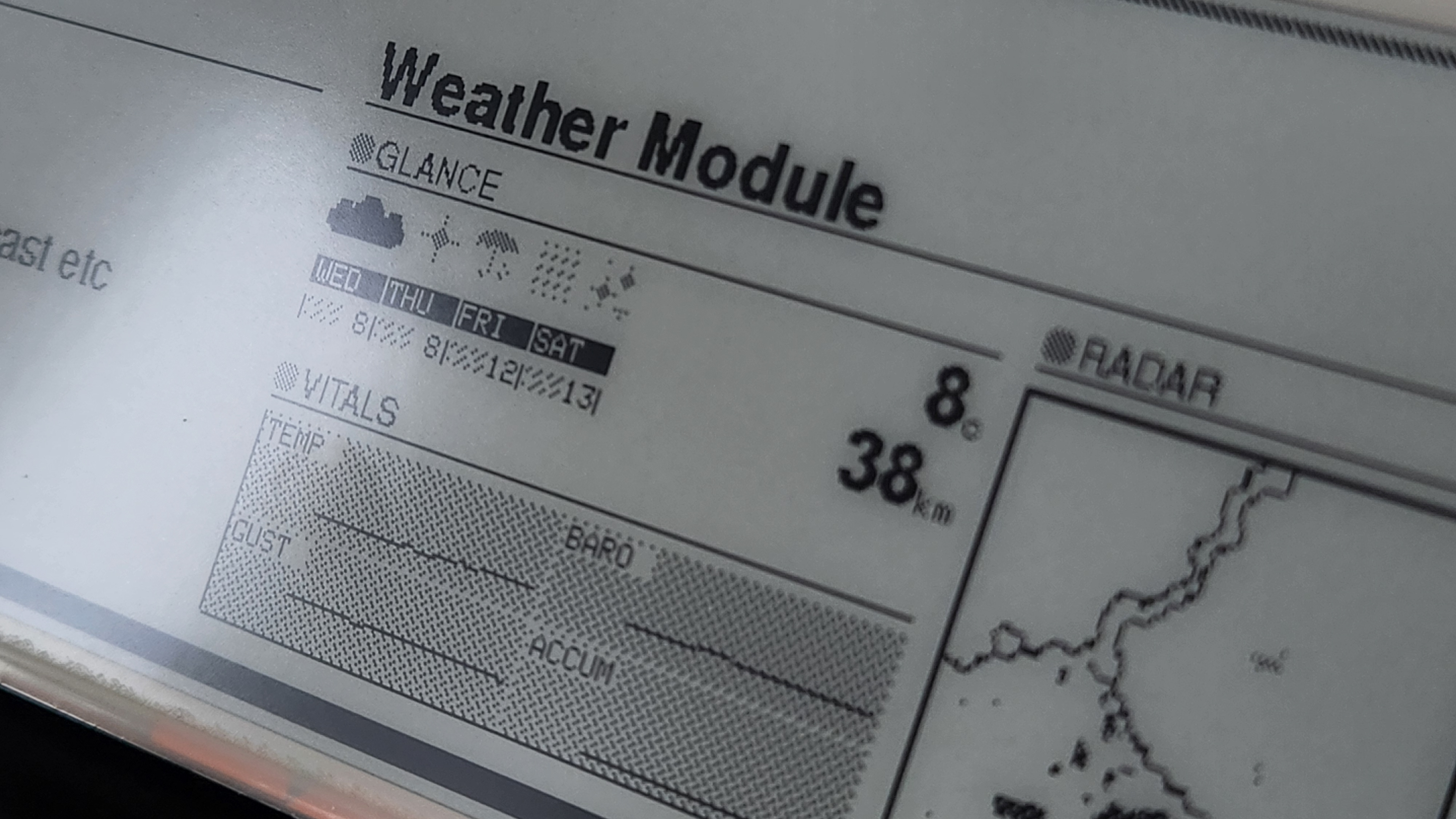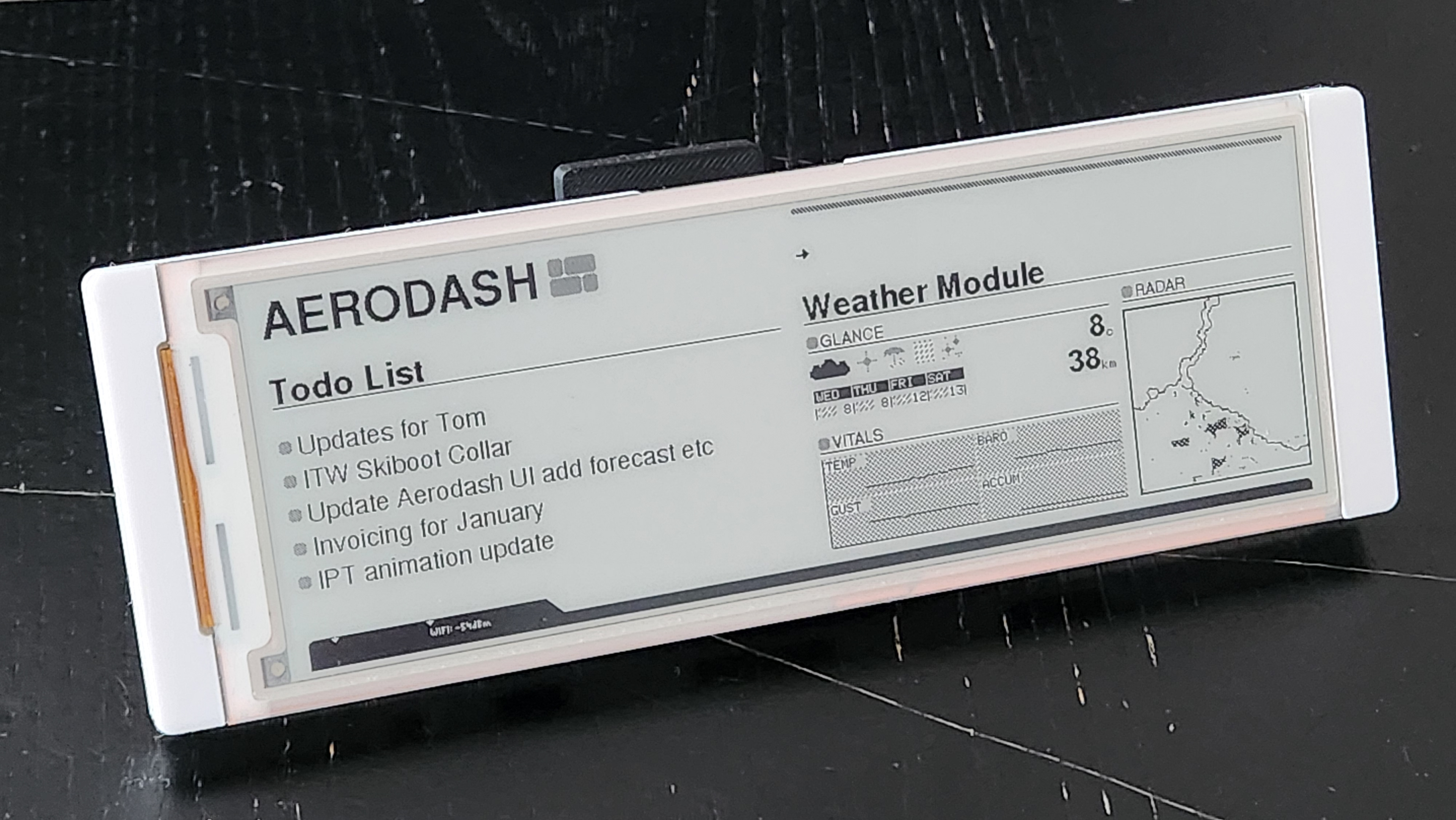 AeroDash is a custom IoT dashboard built on an ESP32-S3 microcontroller that drives a 5.79" ultra-wide e-paper display (792×272 pixels) to show real-time weather and task management data side by side.