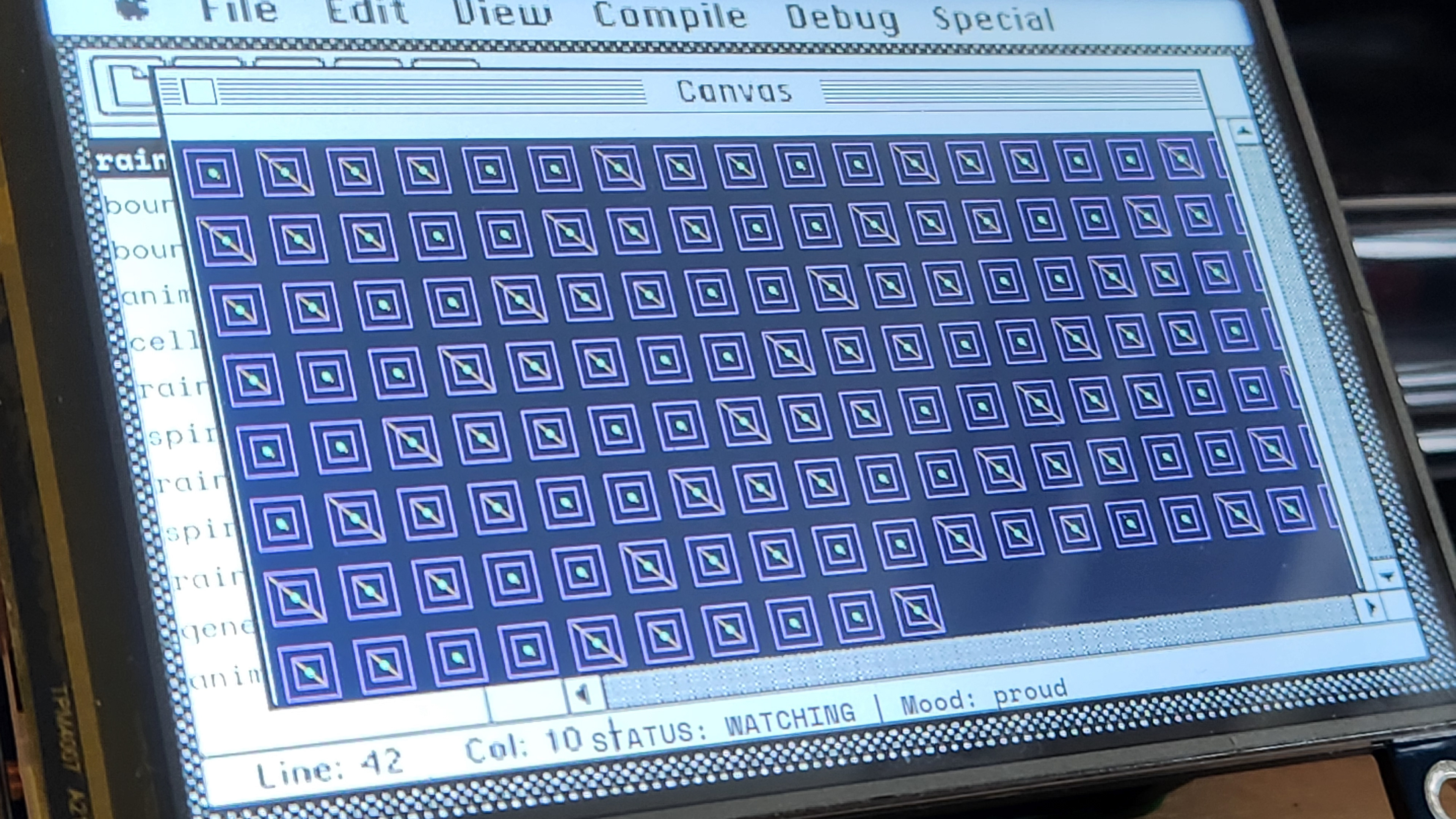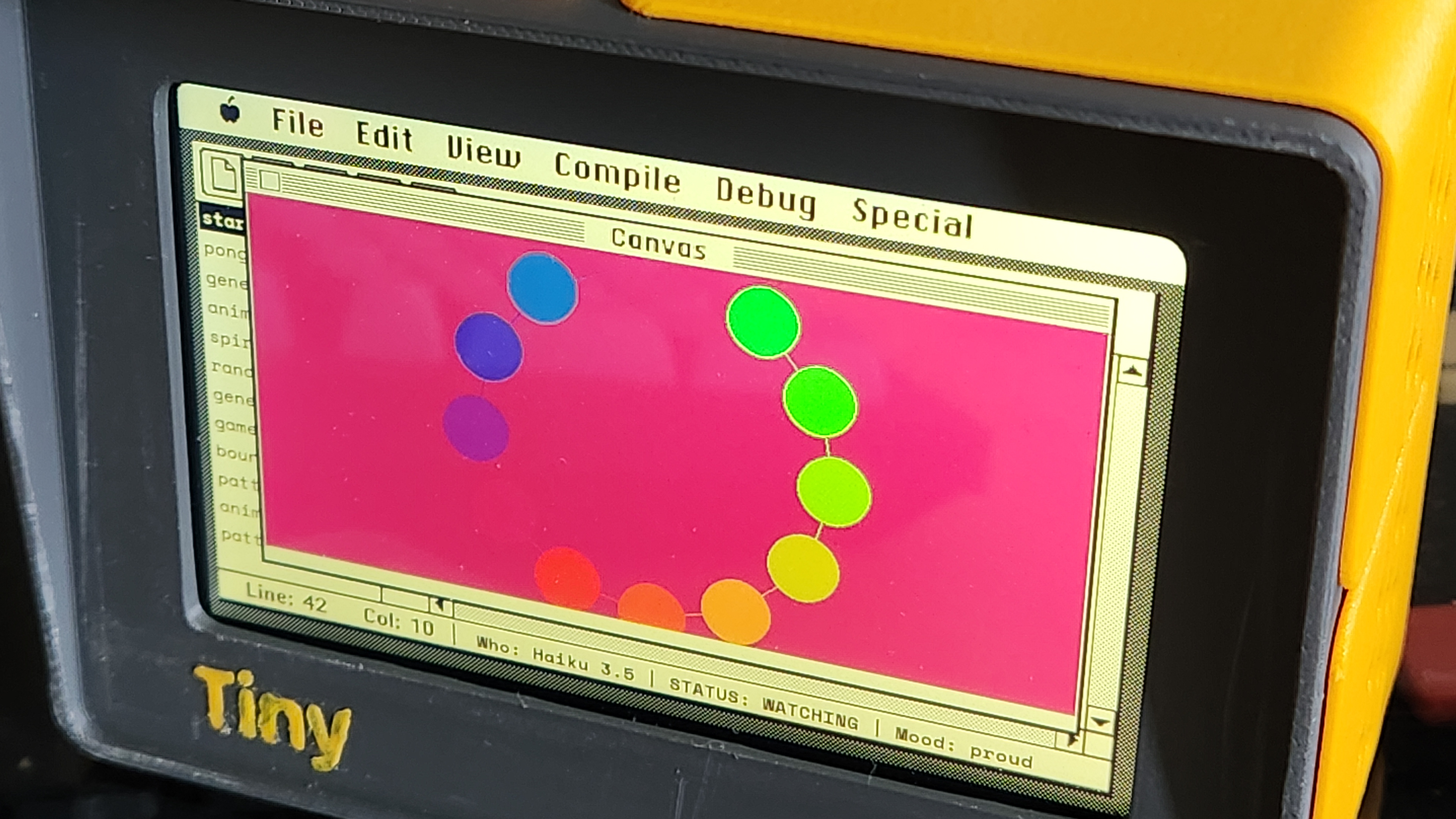 The system features a retro Mac OS-inspired IDE interface displayed on a 4" HDMI display (Pi 4), complete with a file browser, code editor with line numbers, and a canvas popup window for visualizing program output.