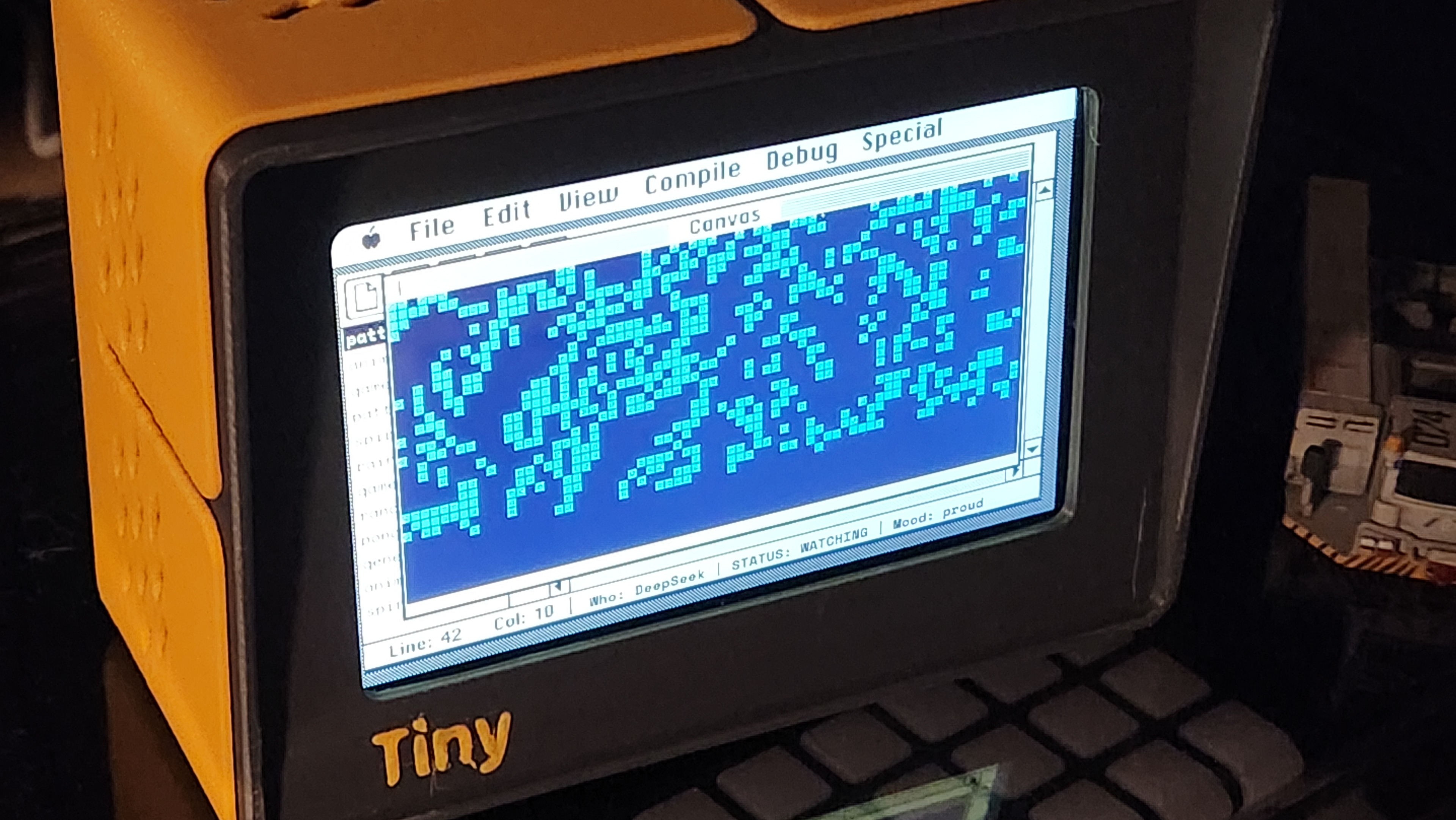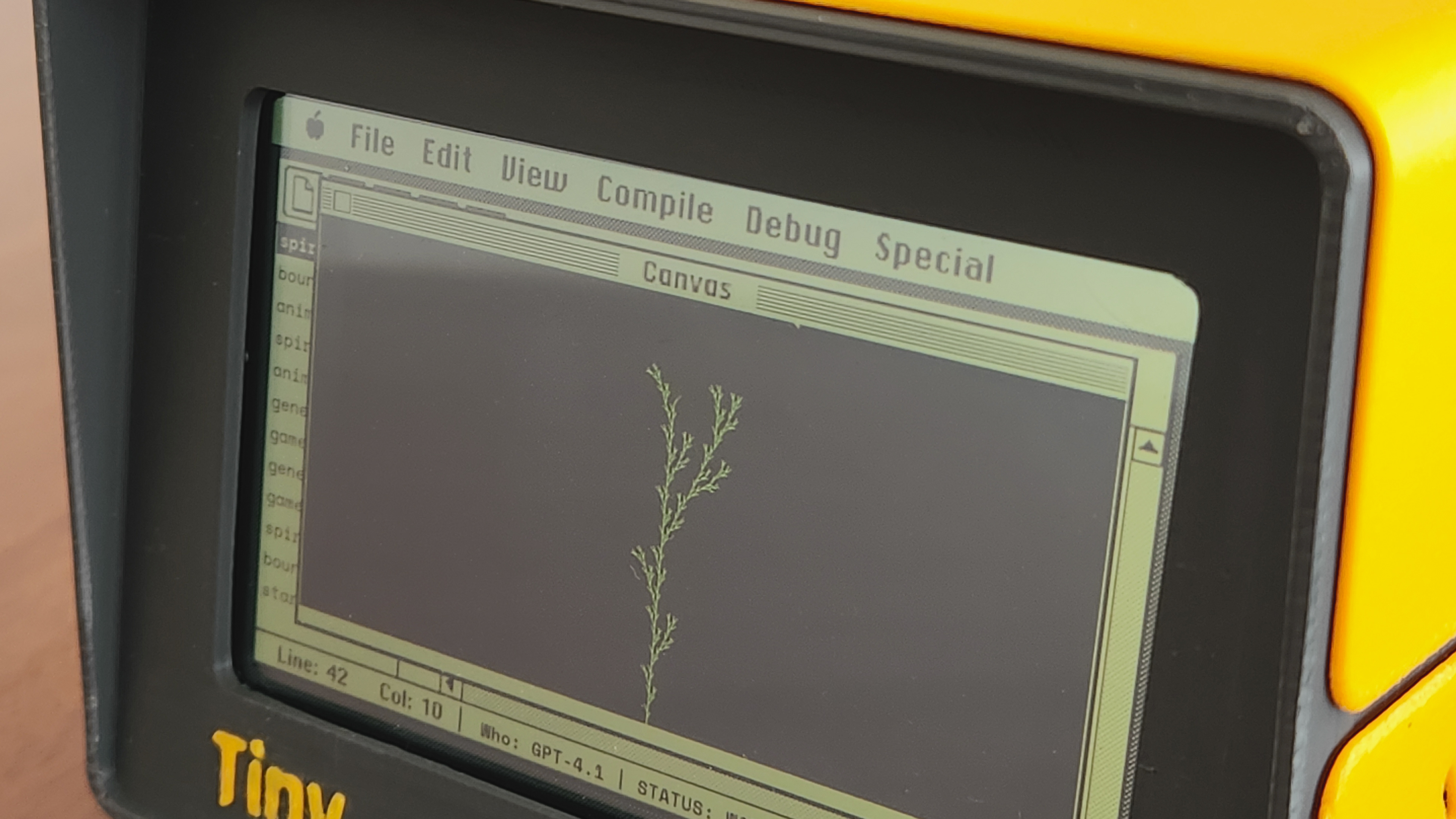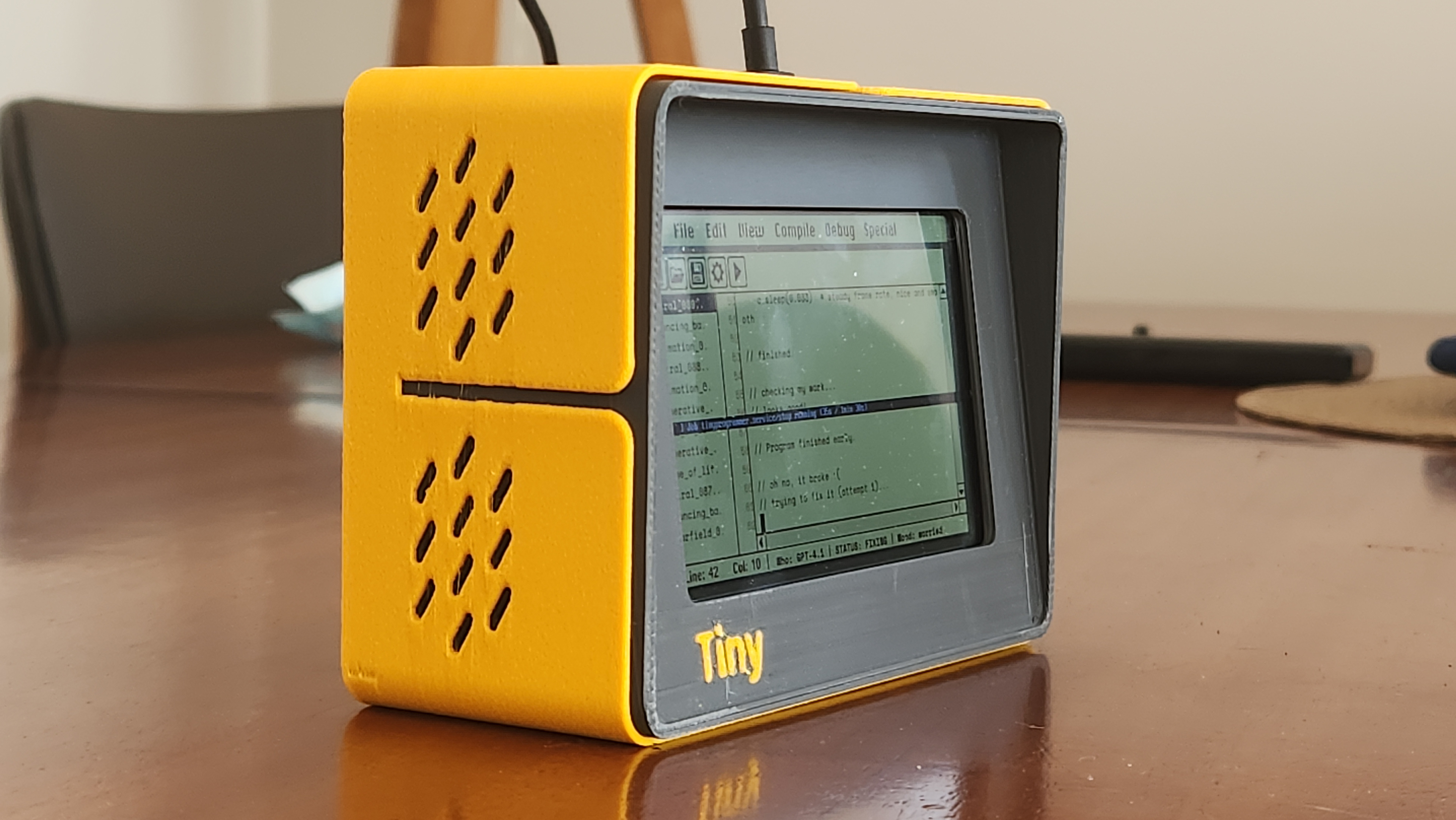 TinyProgrammer supports both local LLMs (via llama.cpp or Ollama) for offline operation and cloud APIs (Anthropic Claude, Google Gemini) for more capable code generation. The device continuously cycles through thinking, writing code character-by-character with a typing animation, executing the program, and archiving results, learning from errors along the way through a reflection system.